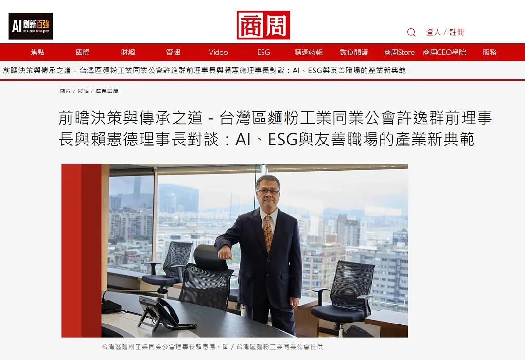 AIESG浪潮席捲全球的此刻,台灣區麵粉工業同業公會以創新思維與永續行動,成為傳統產業轉型的典範。這一切,始於前理事長許逸群先生任內提出的關鍵遠見「智慧連結、永續共榮」,率先推動數位轉型與視訊會議概念;而現任理事長賴憲德先生則承接並深化這份理念,穩健落實,成功建構AI智能會議室,實踐綠色治理與友善職場。兩位理事長於本次專訪中,同場分享從前瞻願景到永續實踐的精彩歷程。