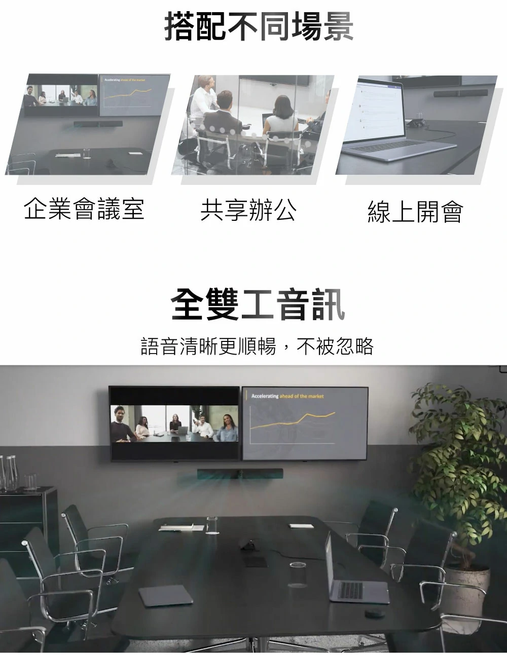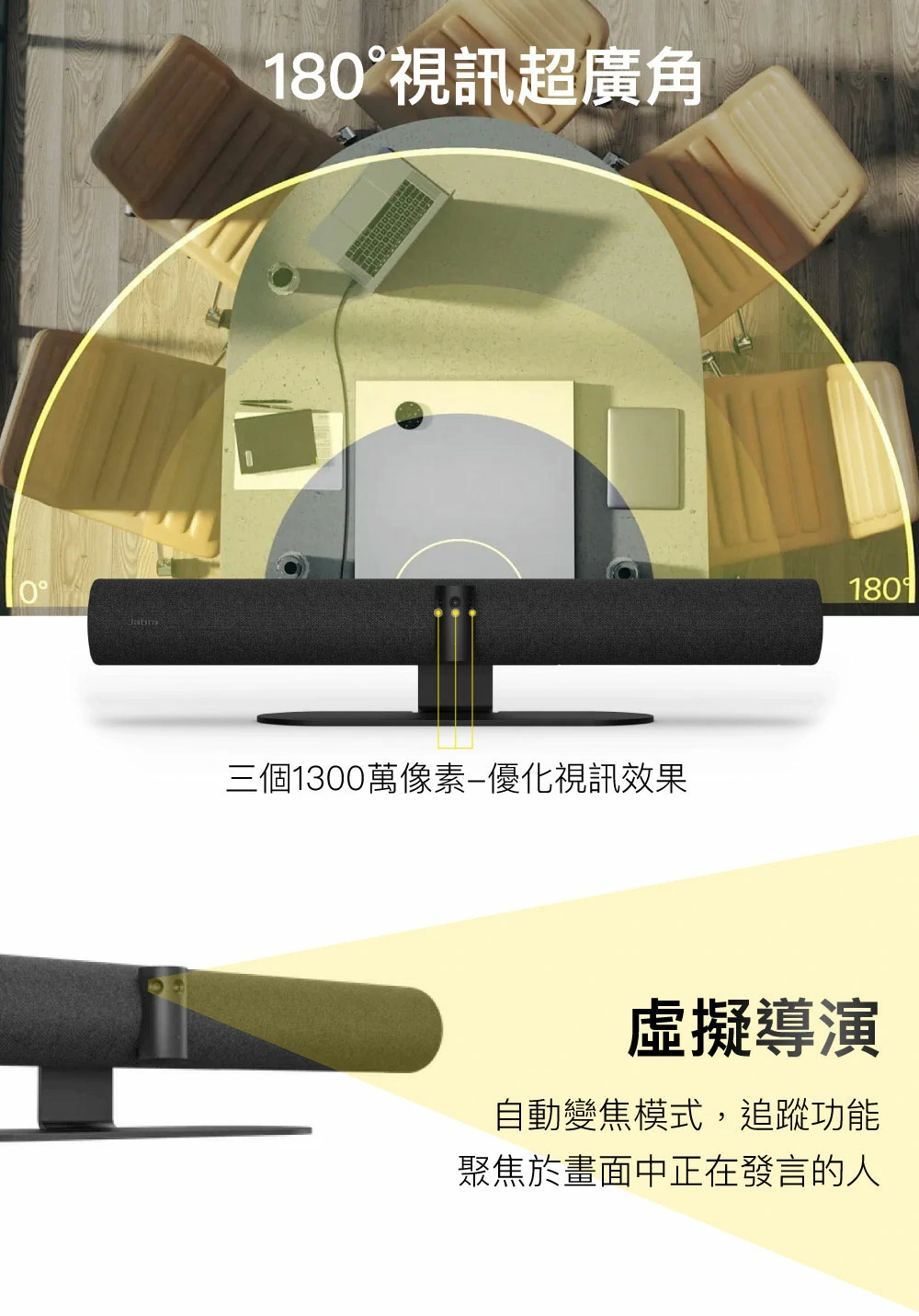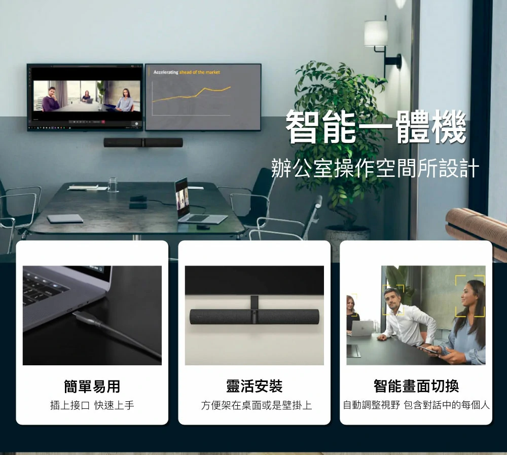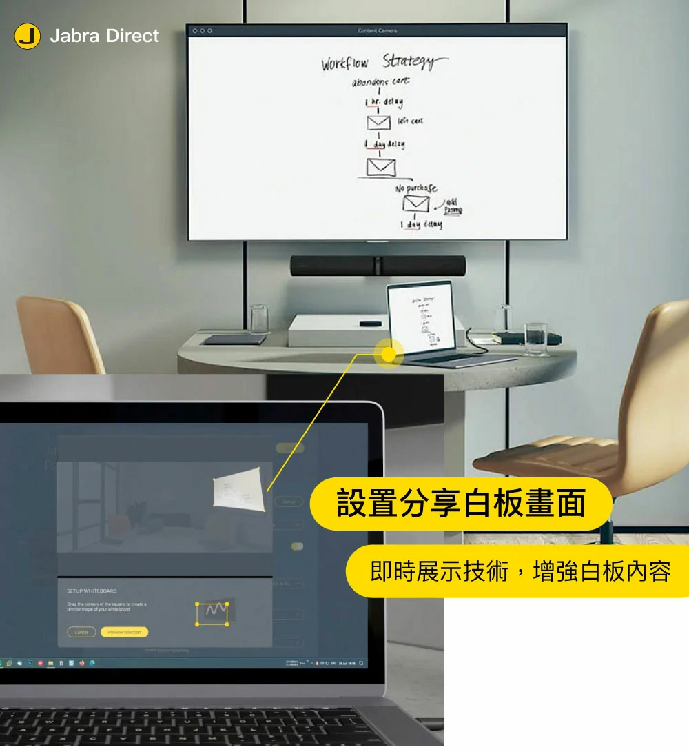 (智能軟體自動糾正透視圖以確保最佳視角,同時透過減少光澤、光亮和陰影以及增強標記筆劃的顏色和對比度來即時改善影像。輔助內容攝像頭流串允許您以雙重串流方式同時顯示白板和出席會議的人。)