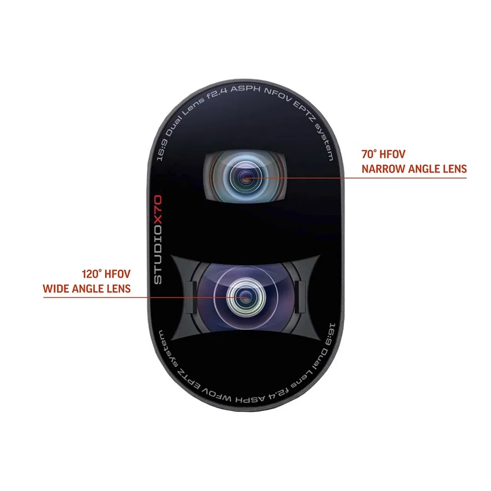 • 4K UHD 雙鏡頭,內建 20MP 感測器,對角視野 (dFoV) 78 ° ;140 ° ,7.3倍數位變焦,智能自動取景,完美平衡廣角與特寫鏡頭,適用於大型會議空間