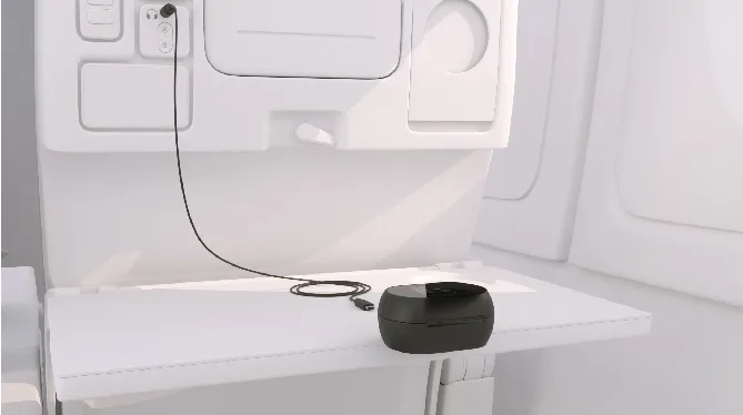 Smart Charge 充電盒包括一個 3.5 mm音訊接口,因此您可以連接機上娛樂影音等外部音源,在沒有電線的情況下欣賞電影。